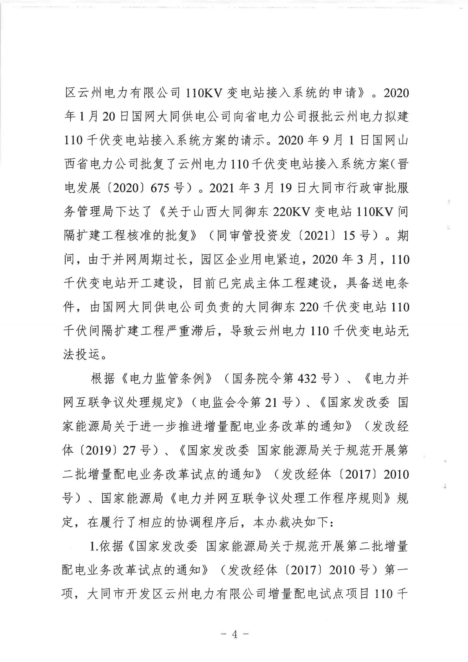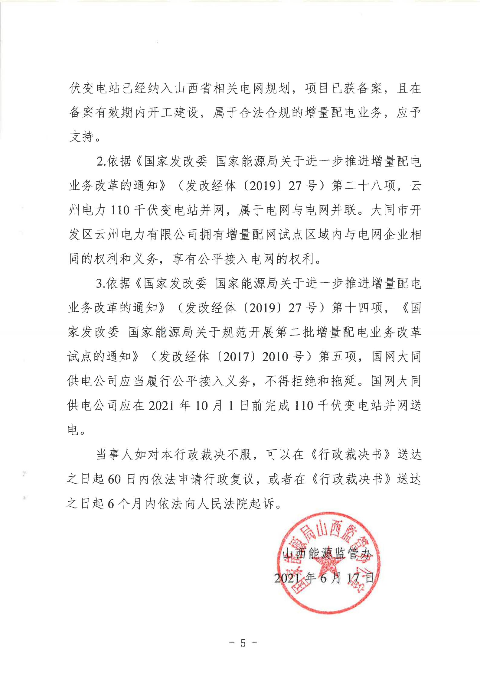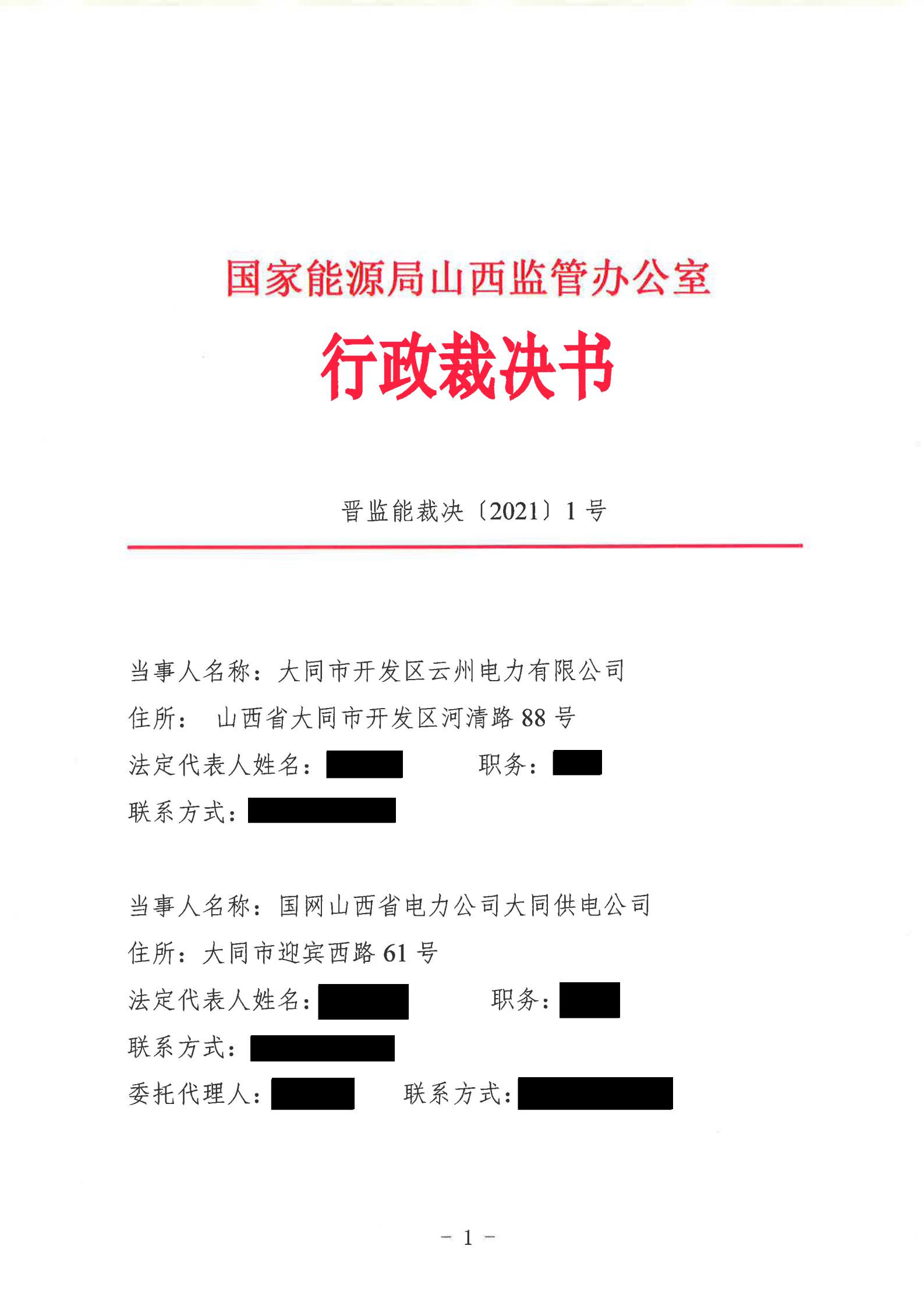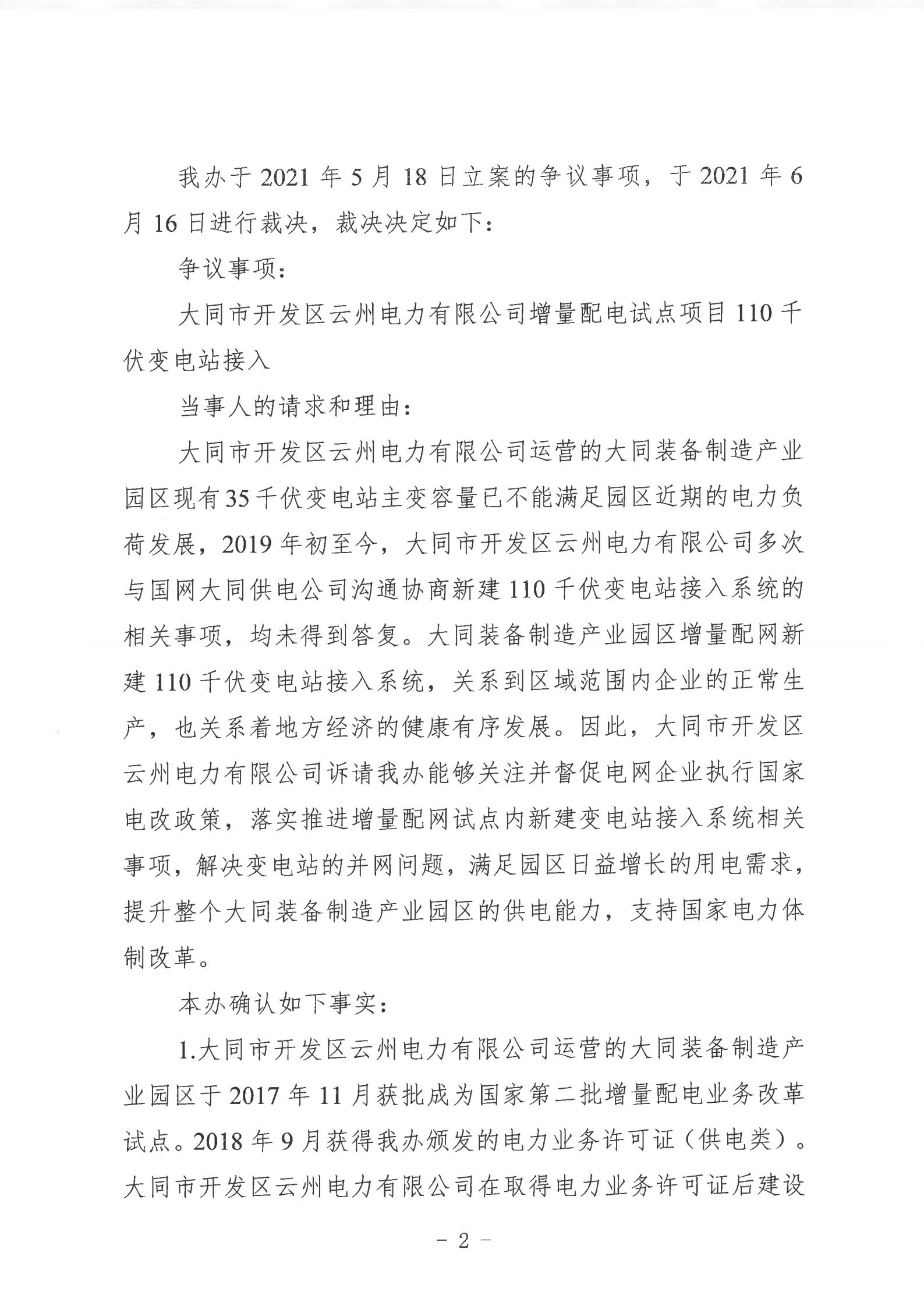 山西能監(jiān)辦近日發(fā)布行政裁決書(晉監(jiān)能裁決【2021】1號),裁決書顯示,山西能監(jiān)辦于2021年5月18日立案爭議事項,于2021年6月16日進行裁決。爭議事項為大同市開發(fā)區(qū)云州電力有限公增量配電試點項目110千伏變電站接入。 當(dāng)事人的請求和理由:大同市開發(fā)區(qū)云州電力有限公司運營的大同裝備制造產(chǎn)業(yè)園區(qū)現(xiàn)有35千伏變電站主變?nèi)萘恳巡荒軡M足園區(qū)近期的電力負荷發(fā)展,2019年初至今,大同市開發(fā)區(qū)云州電力有限公司多次與國網(wǎng)大同供電公司溝通協(xié)商新建110千伏變電站接入系統(tǒng)的相關(guān)事項,均未得到答復(fù)。大同市開發(fā)區(qū)云州電力有限公司訴請山西能監(jiān)辦能夠關(guān)注并督促電網(wǎng)企業(yè)執(zhí)行國家電改政策,落實推進增量配網(wǎng)試點內(nèi)新建變電站接入系統(tǒng)相關(guān)事項,解決變電站的并網(wǎng)問題,滿足園區(qū)日益增長的用電需求,提升整個大同裝備制造產(chǎn)業(yè)園區(qū)的供電能力。 山西能監(jiān)辦裁決: 大同市開發(fā)區(qū)云州電力有限公司增量配電試點項目110千伏變電站已經(jīng)納入山西省相關(guān)電網(wǎng)規(guī)劃,項目已獲備案,且在備案有效期內(nèi)開工建設(shè),屬于合法合規(guī)的增量配電業(yè)務(wù),應(yīng)予支持。 大同市開發(fā)區(qū)云州電力有限公司擁有增量配網(wǎng)試點區(qū)域內(nèi)與電網(wǎng)企業(yè)相同的權(quán)利與義務(wù),享有公平接入電網(wǎng)的權(quán)利。 國網(wǎng)大同供電公司應(yīng)當(dāng)履行公平接入義務(wù),不得拒絕和拖延。國網(wǎng)大同供電公司應(yīng)在2021年10月1日前完成110千伏變電站并網(wǎng)送電。 以下為原文: