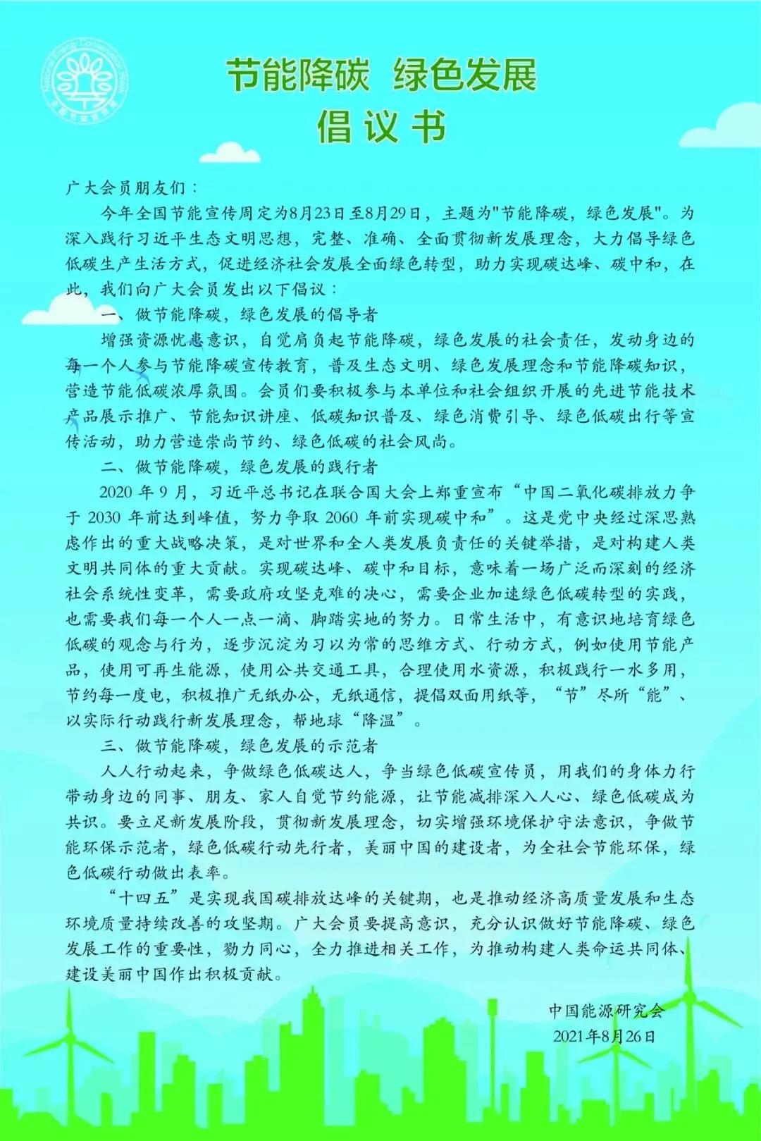 活動中,中國能源研究會發(fā)布了“節(jié)能降碳,綠色發(fā)展”倡議書,號召廣大會員爭做“節(jié)能降碳、綠色發(fā)展”的倡導者、踐行者和示范者,為建設美麗中國作出積極貢獻。