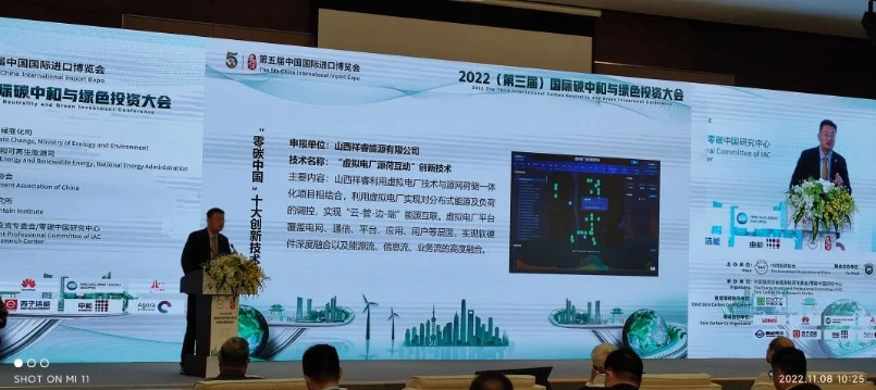 11月8日,在上海舉行的第五屆中國國際進口博覽會上,2022(第三屆)國際碳中和與綠色投資大會暨零碳中國城市峰會隆重舉辦,“零碳中國”成果重磅發(fā)布,祥睿能源的“虛擬電廠源荷互動技術” 榮登“2022年度‘零碳中國’十大創(chuàng)新技術”榜,總工程師孫大偉出席大會并發(fā)表《虛擬電廠與零碳交通》的演講。