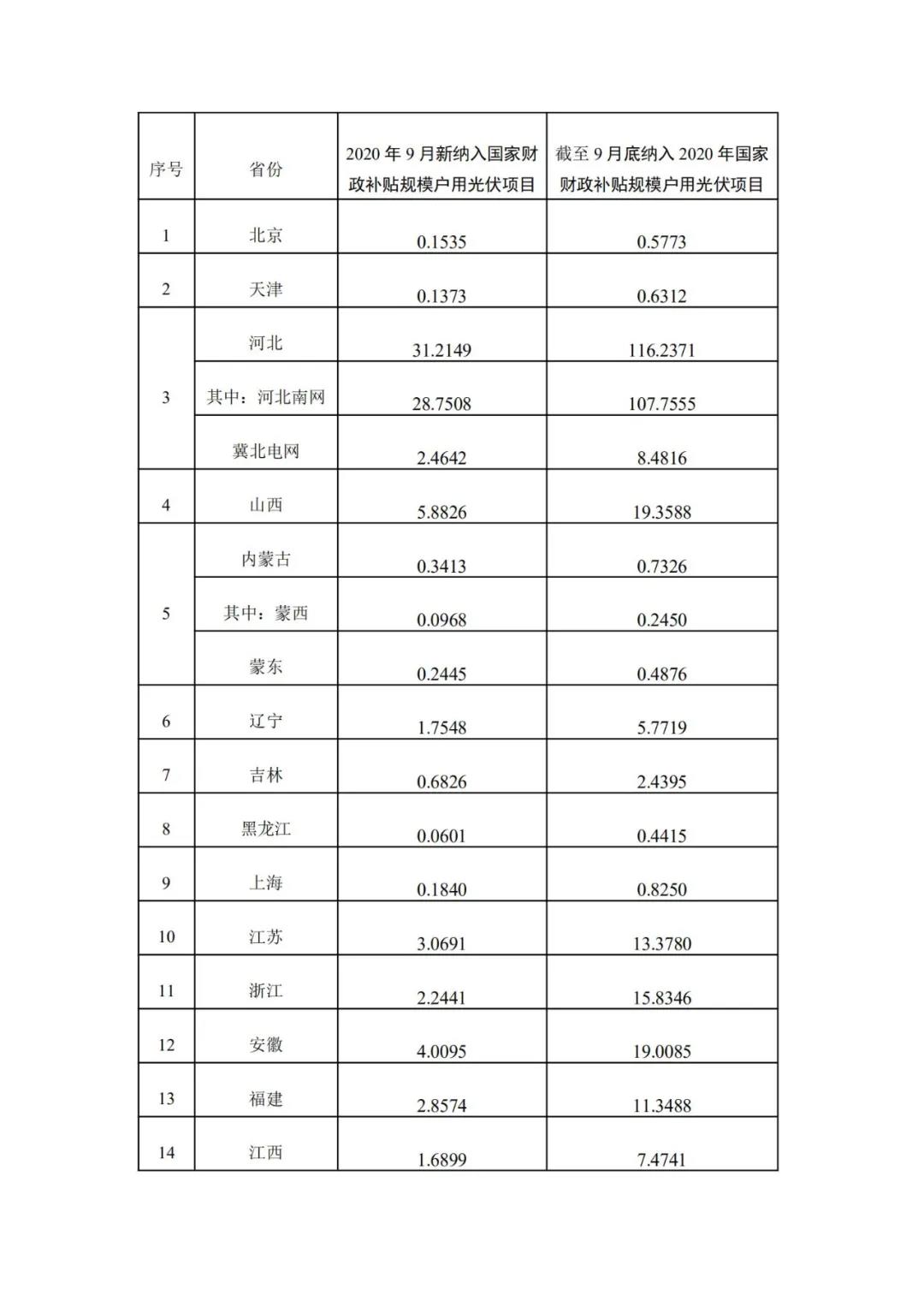按照《國家能源局關(guān)于2020年風電、光伏發(fā)電項目建設(shè)有關(guān)事項的通知》(國能發(fā)新能〔2020〕17號)和《國家能源局綜合司關(guān)于2019年戶用光伏項目信息公布和報送有關(guān)事項的通知》(國能綜通新能〔2019〕45號)關(guān)于戶用光伏項目管理有關(guān)要求,全國共有30個省份報送了戶用光伏項目信息(西藏無納入2020年財政補貼規(guī)模戶用光伏項目,未報送)。 根據(jù)各省級能源主管部門、電網(wǎng)企業(yè)報送信息,經(jīng)國家可再生能源信息管理中心梳理統(tǒng)計,2020年9月新納入國家財政補貼規(guī)模戶用光伏項目總裝機容量為130.1萬千瓦。截至2020年9月底,全國累計納入2020年國家財政補貼規(guī)模戶用光伏項目裝機容量為527.4萬千瓦。詳細情況見附表。 附表:納入2020年國家財政補貼規(guī)模戶用光伏項目裝機 容量統(tǒng)計表(截至2020年9月30日) 附表 納入2020年國家財政補貼規(guī)模戶用光伏項目 裝機容量統(tǒng)計表 (截至2020年9月30日)