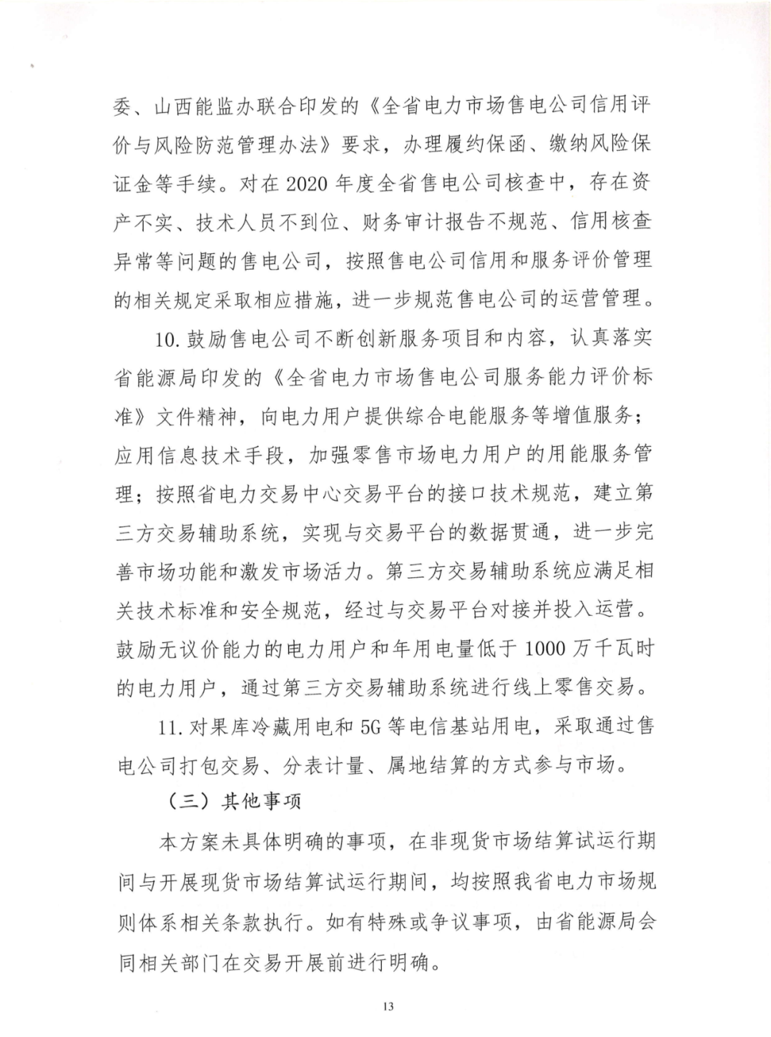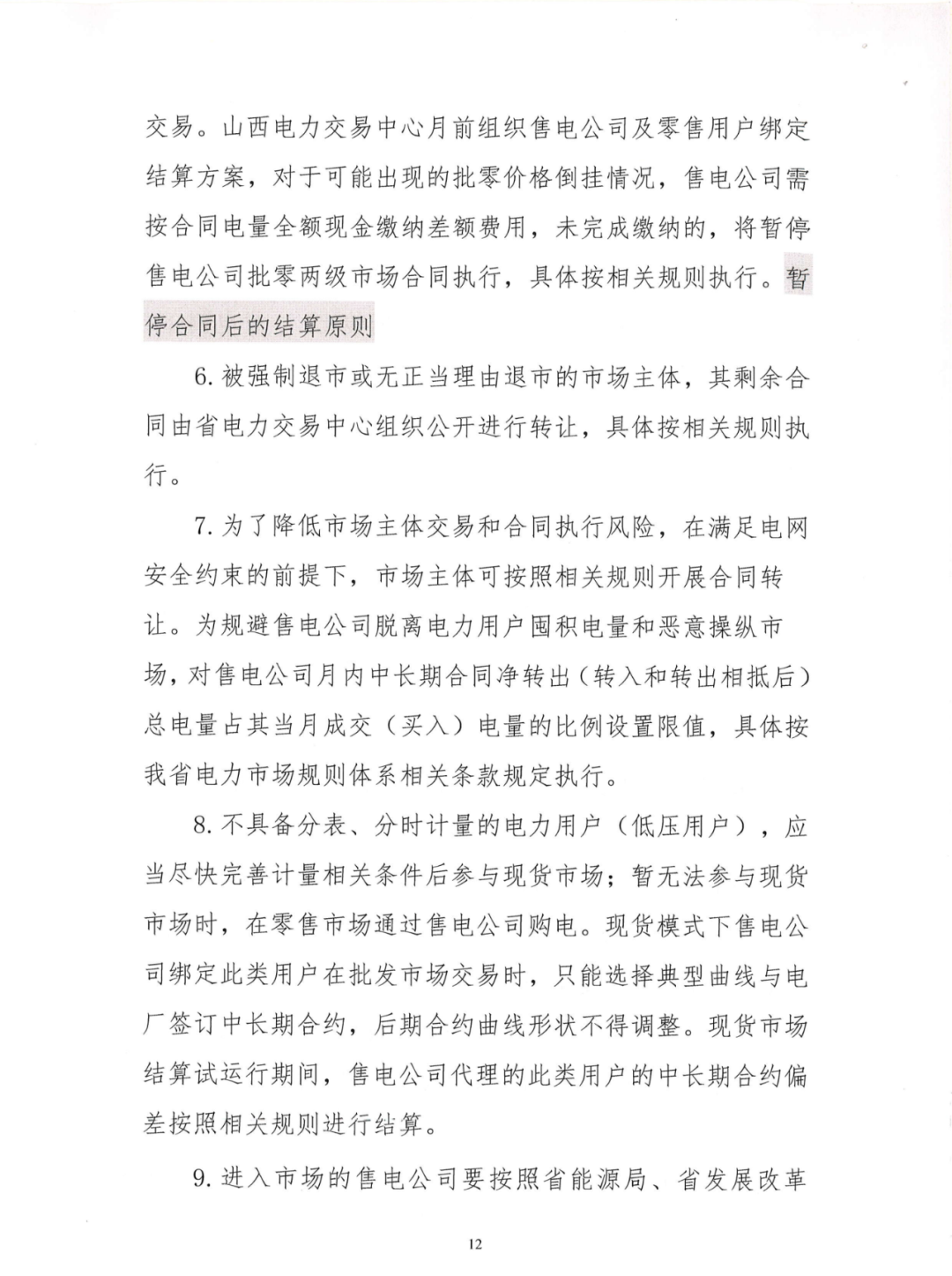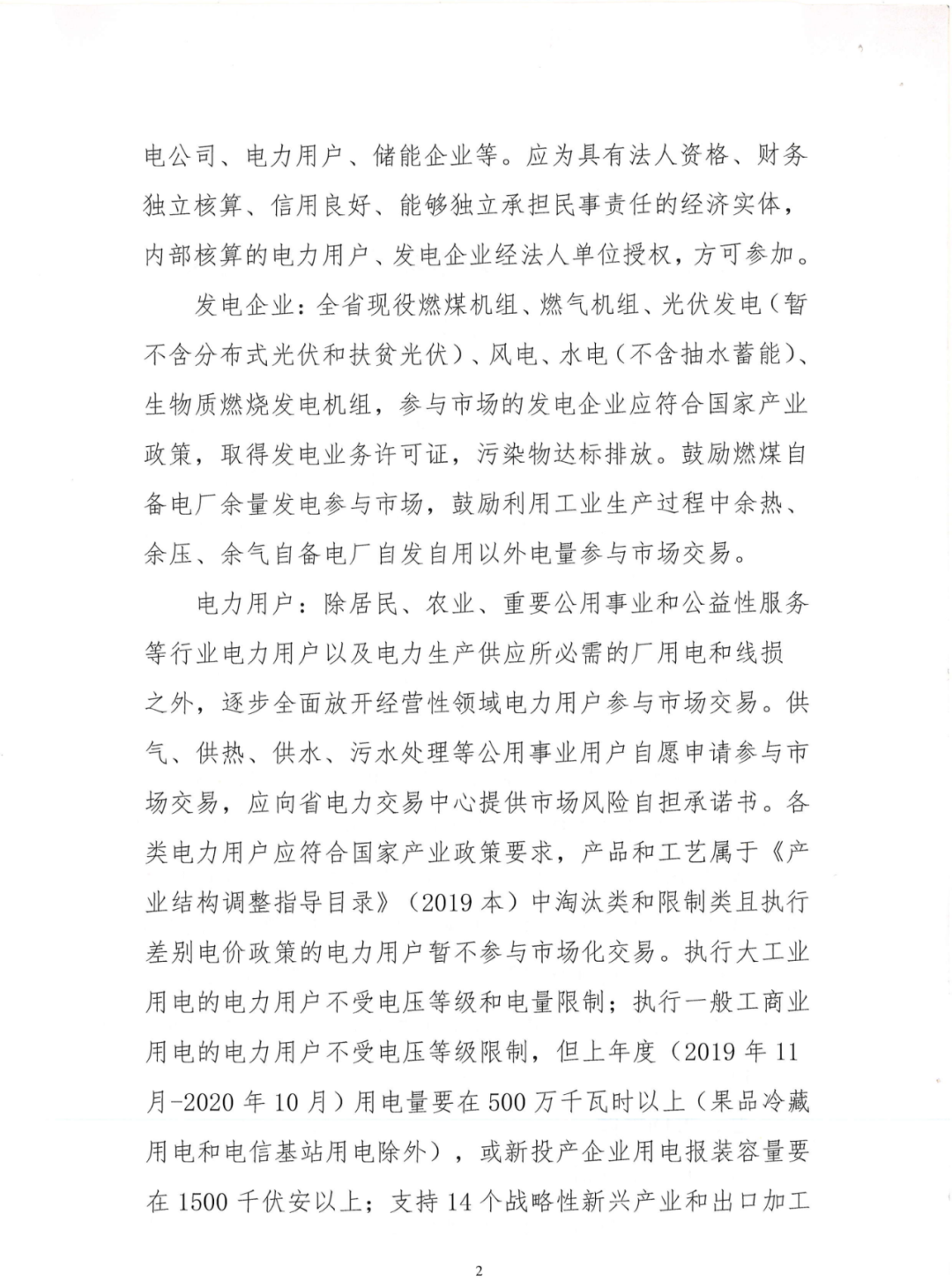 山西近期出臺(tái)《2021年山西省電力市場(chǎng)交易組織方案(征求意見(jiàn)稿)》。其中稱(chēng)為規(guī)避市場(chǎng)風(fēng)險(xiǎn)、推動(dòng)線上交易,普通交易暫不開(kāi)展年度交易、不采取雙邊交易方式。有人反映:取消雙邊交易對(duì)明年的市場(chǎng)影響非常大,售電公司可能面臨毀約的風(fēng)險(xiǎn)。 2021年山西省發(fā)電量調(diào)控目標(biāo)預(yù)安排為∶優(yōu)先發(fā)電量838億千瓦時(shí),市場(chǎng)化發(fā)電量1462億千瓦時(shí)(含自備機(jī)組發(fā)電量129億千瓦時(shí)),折算市場(chǎng)交易電量1300億千瓦時(shí)。 電力用戶(hù)∶除居民、農(nóng)業(yè)、重要公用事業(yè)和公益性服務(wù)等行業(yè)電力用戶(hù)以及電力生產(chǎn)供應(yīng)所必需的廠用電和線損之外,逐步全面放開(kāi)經(jīng)營(yíng)性領(lǐng)域電力用戶(hù)參與市場(chǎng)交易。供氣、供熱、供水、污水處理等公用事業(yè)用戶(hù)自愿申請(qǐng)參與市場(chǎng)交易,應(yīng)向省電力交易中心提供市場(chǎng)風(fēng)險(xiǎn)自擔(dān)承諾書(shū)。 執(zhí)行大工業(yè)用電的電力用戶(hù)不受電壓等級(jí)和電量限制;執(zhí)行一般工商業(yè)用電的電力用戶(hù)不受電壓等級(jí)限制,但上年度(2019年11 月-2020年10月)用電量要在500萬(wàn)千瓦時(shí)以上(果品冷藏用電和電信基站用電除外),或新投產(chǎn)企業(yè)用電報(bào)裝容量要在1500千伏安以上;支持14個(gè)戰(zhàn)略性新興產(chǎn)業(yè)和出口加工貿(mào)易類(lèi)企業(yè)、"煤改電"交易電量全電量參與市場(chǎng)交易,不受電壓等級(jí)和電量限制;支持增量配電網(wǎng)試點(diǎn)參與市場(chǎng)交易,擁有配電網(wǎng)運(yùn)營(yíng)權(quán)的售電公司、區(qū)域內(nèi)電力用戶(hù)以打包形式全電量參與市場(chǎng)交易,不受電壓等級(jí)和電量限制。 山西電力交易中心月前組織售電公司及零售用戶(hù)綁定結(jié)算方案,對(duì)于可能出現(xiàn)的批零價(jià)格倒掛情況,售電公司需按合同電量全額現(xiàn)金繳納差額費(fèi)用,未完成繳納的,將暫停售電公司批零兩級(jí)市場(chǎng)合同執(zhí)行,具體按相關(guān)規(guī)則執(zhí)行。暫停合同后的結(jié)算原則。 詳情如下: