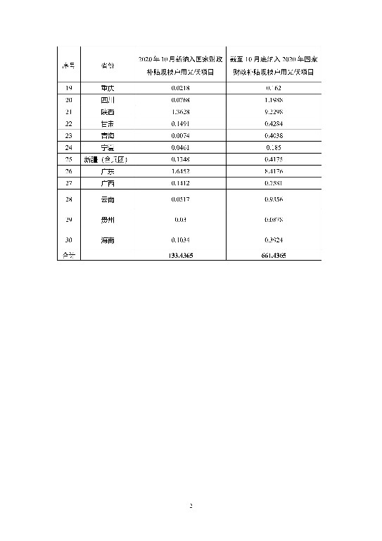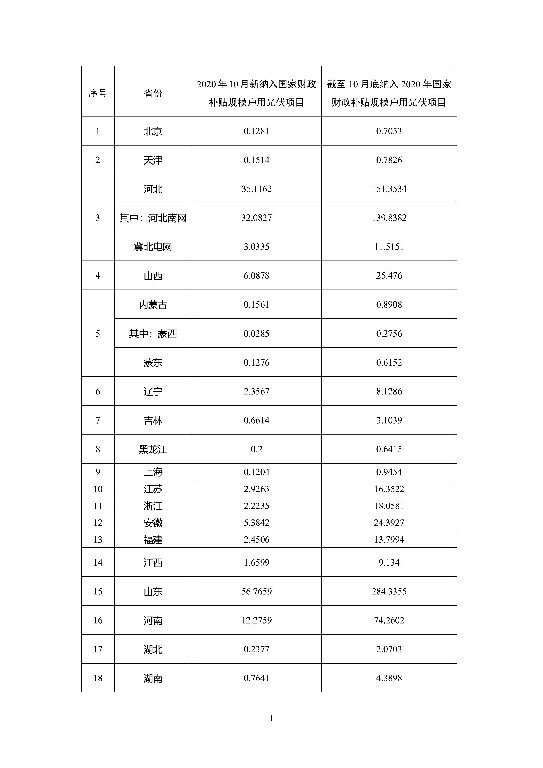 注:1.山西、蒙西、吉林、江蘇、山東、河南、湖北、重慶、四川、陜西、廣東、貴州、海南根據(jù)實際情況對9月底前建成并網(wǎng)戶用光伏項目進行了修正,具體項目信息見各省公布情況。 2.西藏?zé)o納入2020年財政補貼規(guī)模戶用光伏項目,未報送。 來源:國家能源局 (如有侵權(quán),請聯(lián)系刪除)