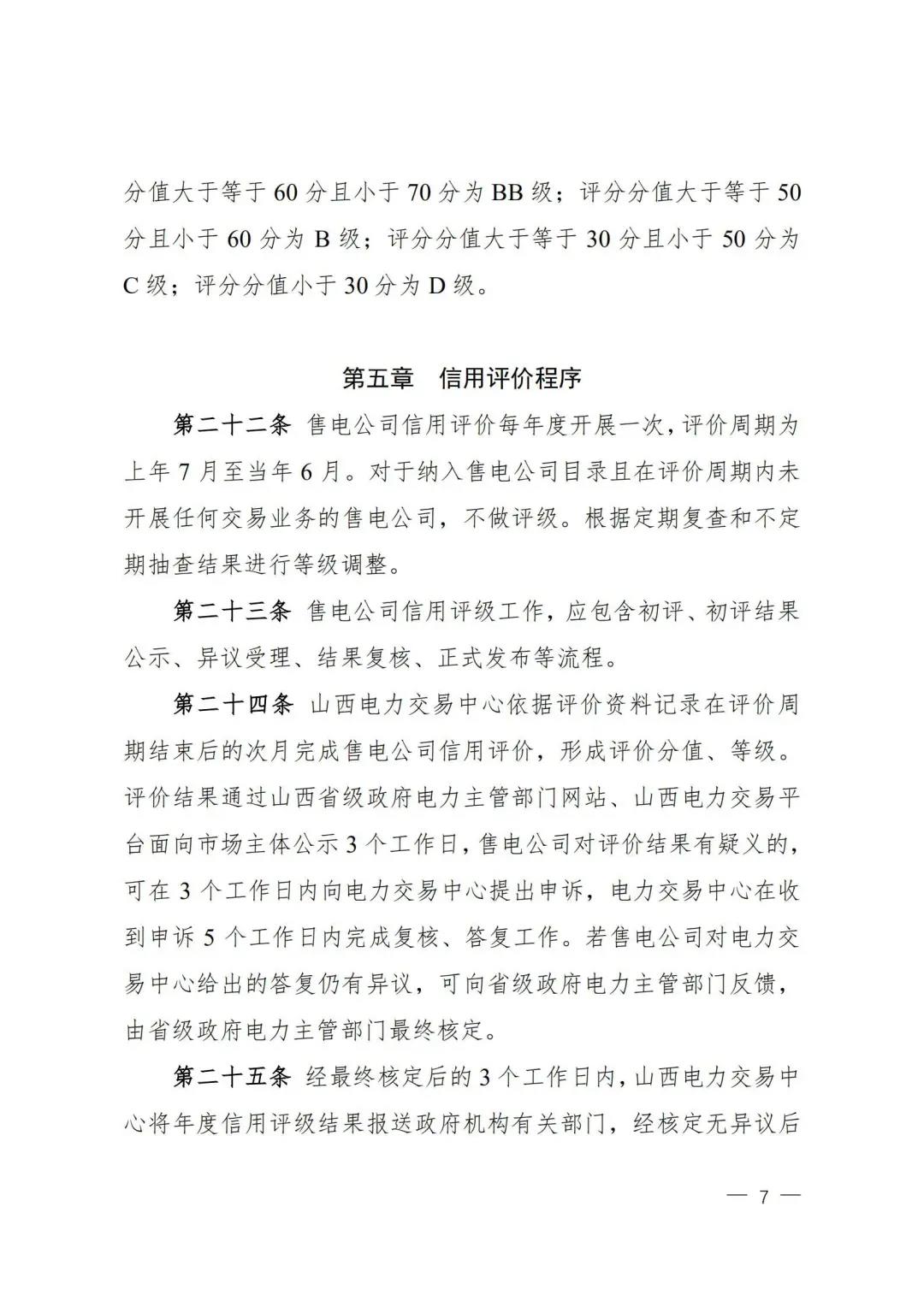 山西省能源局日前發(fā)布了關(guān)于印發(fā)《全省電力市場售電公司信用評價與風(fēng)險防范管理辦法》(試行)的通知,建立售電公司信用評價機制,年度評定售電公司信用等級,本辦法信用評級為AAA、AA、A、BB、B、C、D 七個等級。 依據(jù)信用評價等級開展售電公司風(fēng)險防范管理。售電公司風(fēng)險級別按照嚴(yán)重程度劃分為低風(fēng)險、一般風(fēng)險、較大風(fēng)險、 重大風(fēng)險四個級別,低風(fēng)險對應(yīng)信用評級結(jié)果為 BB 級及以上或無評級、一般風(fēng)險對應(yīng)信用評級結(jié)果為 B 級、較大風(fēng)險對應(yīng)信用 評級結(jié)果為 C 級、重大風(fēng)險對應(yīng)信用評級結(jié)果為D級。 依據(jù)風(fēng)險級別分別執(zhí)行履約保函、履約保險或風(fēng)險保證金等風(fēng)險防范管理措施。低風(fēng)險售電公司,可選擇執(zhí)行履約保 函、履約保險兩種方式中的一種風(fēng)險防范管理措施;一般風(fēng)險、 較大風(fēng)險售電公司,執(zhí)行風(fēng)險保證金制度措施。 低風(fēng)險售電公司可選擇執(zhí)行履約保函或履約保險風(fēng) 險防范管理措施。選擇履約保函的售電公司須按照對應(yīng)系數(shù)遞交 不低于未來3 個月待結(jié)算合同電量對應(yīng)的保函額度,售電公司實 際遞交履約保函額度=標(biāo)準(zhǔn)額度×遞交履約保函系數(shù),遞交履約保 函系數(shù)為:AAA 級 0.1,AA 級 0.3,A 級 0.6,BB 級以及無評級 1.0。 詳情如下: 關(guān)于印發(fā)《全省電力市場售電公司信用評價與風(fēng)險防范管理辦法》(試行)的通知 各市能源局、發(fā)展改革委,省電力公司、山西電力交易中心有限公司,各相關(guān)售電公司: 為進一步規(guī)范我省市場主體行為,強化事中事后管理,降低電力市場交易風(fēng)險,維護社會公共利益和市場主體合法權(quán)益,山西省能源局會同山西省發(fā)改委和山西能監(jiān)辦制定了《全省電力市場售電公司信用評價與風(fēng)險防范管理辦法》(試行)現(xiàn)予印發(fā),請各相關(guān)市場成員遵照執(zhí)行?,F(xiàn)就有關(guān)事宜通知如下: 一、近年來,全省售電側(cè)改革加速推進,電力批發(fā)和零售兩級市場初步建立,市場活力得到有效激發(fā)。但由于我省售電市場剛剛起步,部分售電公司在信用承諾、市場競爭、合同履行方面仍存在問題。開展售電公司信用評價和風(fēng)險防范工作,有利于規(guī)范全省售電市場行為,推進電力市場化建設(shè),提升全社會用電效率。 二、省級政府電力主管部門、信用管理部門和電力監(jiān)管機構(gòu),負(fù)責(zé)建立完善山西電力市場售電公司信用體系、風(fēng)險防控機制,建立聯(lián)席會議制度,聯(lián)席會議辦公室設(shè)在省能源局。 三、全省電力市場售電公司信用評價工作委托山西電力交易中心具體負(fù)責(zé),評價全過程不收任何費用。請山西電力交易中心按照《全省電力市場售電公司信用評價與風(fēng)險防范管理辦法》,科學(xué)組織,依法依規(guī)開展售電公司信用評價工作,并將評價結(jié)果向社會公布,接受社會監(jiān)督,確保評價全過程數(shù)據(jù)信息公平、公開、透明、可追溯。要將售電公司信用評價與風(fēng)險防范管理相結(jié)合,加強履約保函(保險)、風(fēng)險保證金的管理和應(yīng)用,引導(dǎo)售電公司積極參與電力市場交易。 四、售電公司要進一步提高認(rèn)識,從規(guī)范全省電力市場,化解市場交易風(fēng)險出發(fā),積極響應(yīng)、主動參與全省電力市場售電公司信用評價和風(fēng)險防范工作,共同營造公平誠信、健康有序的售電市場環(huán)境,為推動全省經(jīng)濟高質(zhì)量轉(zhuǎn)型發(fā)展提供綠色、穩(wěn)定、廉價的電力保障。 附件:全省電力市場售電公司信用評價與風(fēng)險防范管理辦法(試行).pdf 山西省能源局 山西省發(fā)展和改革委員會 國家能源局 山西監(jiān)管辦公室 2020年11月12日 |