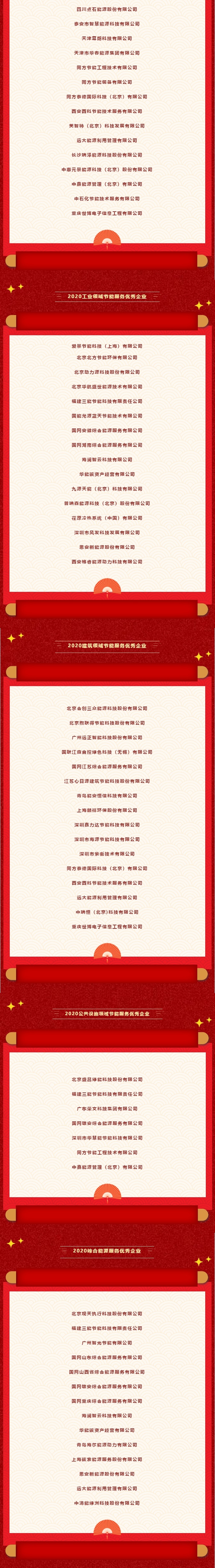 授予安徽省安泰科技股份有限公司等31家單位為“2020節(jié)能服務(wù)產(chǎn)業(yè)品牌企業(yè)”榮譽(yù)稱號(hào); 授予鞍鋼集團(tuán)節(jié)能技術(shù)服務(wù)有限公司等12家單位為“2020節(jié)能服務(wù)產(chǎn)業(yè)最具成長(zhǎng)性企業(yè)”榮譽(yù)稱號(hào); 授予阿里斯頓熱能產(chǎn)品(中國(guó))有限公司(ELCO)等15家單位為“2020節(jié)能服務(wù)產(chǎn)業(yè)創(chuàng)新企業(yè)”榮譽(yù)稱號(hào);授予愛(ài)景節(jié)能科技(上海)有限公司等61家單位為“2020節(jié)能服務(wù)產(chǎn)業(yè)重合同守信用企業(yè)”榮譽(yù)稱號(hào); 授予北京北方節(jié)能環(huán)保有限公司等16家單位為“2020工業(yè)領(lǐng)域節(jié)能服務(wù)優(yōu)秀企業(yè)”榮譽(yù)稱號(hào); 授予國(guó)聯(lián)江森自控綠色科技(無(wú)錫)有限公司等16家單位為“2020建筑領(lǐng)域節(jié)能服務(wù)優(yōu)秀企業(yè)”榮譽(yù)稱號(hào); 授予同方節(jié)能工程技術(shù)有限公司等7家單位為“2020公共設(shè)施領(lǐng)域節(jié)能服務(wù)優(yōu)秀企業(yè)”榮譽(yù)稱號(hào); 授予福建三能節(jié)能科技有限責(zé)任公司等14家單位為“2020綜合能源服務(wù)優(yōu)秀企業(yè)”榮譽(yù)稱號(hào); 授予北京綠洲德瀚環(huán)境保護(hù)中心有限責(zé)任公司等17家單位為“2020清潔供熱服務(wù)優(yōu)秀企業(yè)”榮譽(yù)稱號(hào); 授予中嘉能源管理(北京)有限公司等123家單位為“2020 EMCA優(yōu)秀會(huì)員單位”榮譽(yù)稱號(hào); 授予海瀾智云科技有限公司“海瀾工業(yè)互聯(lián)網(wǎng)智慧云平臺(tái)·智慧系統(tǒng)節(jié)能技術(shù)”等12項(xiàng)技術(shù)為“2020優(yōu)秀節(jié)能與能效提升技術(shù)”榮譽(yù)稱號(hào); 授予北京動(dòng)力源科技股份有限公司實(shí)施的“河南能源化工集團(tuán)鶴壁煤化工有限公司蒸汽階梯利用合同能源管理項(xiàng)目”等40個(gè)項(xiàng)目為“2020合同能源管理優(yōu)秀項(xiàng)目”榮譽(yù)稱號(hào); 授予青島海爾能源動(dòng)力有限公司總經(jīng)理-柴紀(jì)強(qiáng)等9人為“2020節(jié)能服務(wù)產(chǎn)業(yè)優(yōu)秀企業(yè)家”榮譽(yù)稱號(hào); 授予國(guó)能龍?jiān)此{(lán)天節(jié)能技術(shù)有限公司黨委委員、副總經(jīng)理-陳振宇等57人為“2020節(jié)能服務(wù)產(chǎn)業(yè)先進(jìn)工作者”榮譽(yù)稱號(hào)。